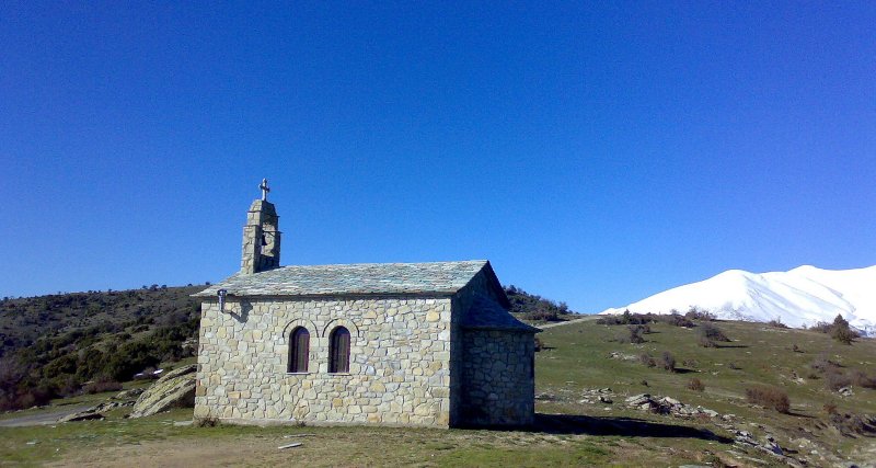 Bergkapelle am südlichen Ende des Hochplateaus von Kalipefki, einem Dorf auf 1.050 m im Gebiet des Unteren Olymps – Kato Olympus